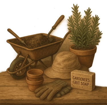 Gardener’s Grit is a scrubby hand soap designed for removing dirt, clay, and garden residue. It includes natural exfoliants like pumice, ground coffee, or oats to gently lift debris from the skin while still maintaining a creamy tallow-based lather.