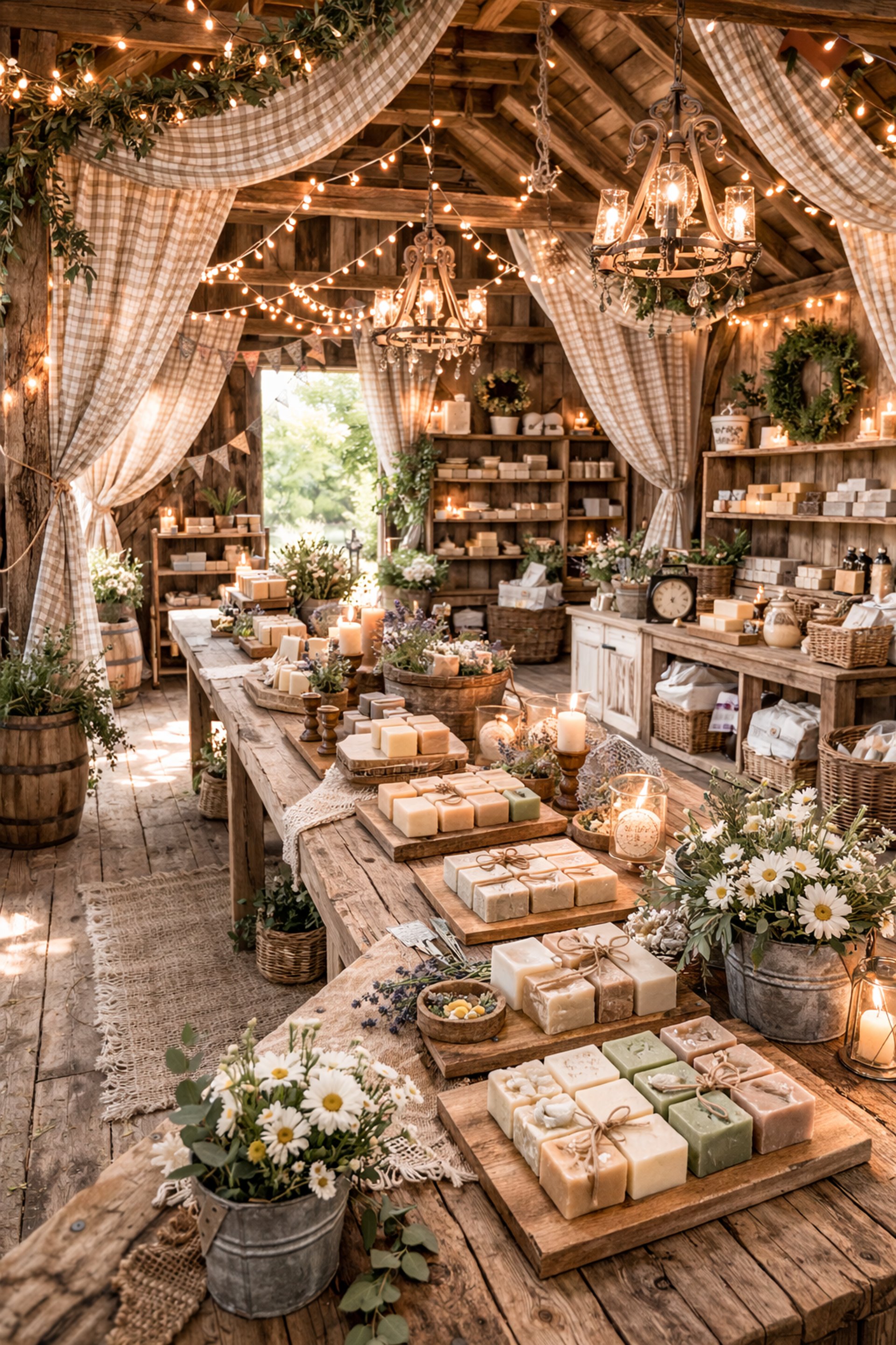 It spills through the barn doors in that soft country way — warm, patient, unhurried — warm rays dancing like they have all the time in the world. The gingham curtains sway just enough to remind you that something gentle lives here. Something handmade. Something cared for.
